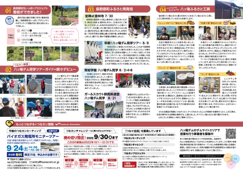 活動報告は、TAKIVIVAで行われたつなカン事業「つなカンミーティング」、つなカンプロジェクト「花が繋ぐ未来の長野原~花育~ 長野原町花いっぱいプロジェクト」、つなカン事業「八ッ場ダム見学ツアーガイド養成講座のその後」と「長野原町ふるさと再発見」。