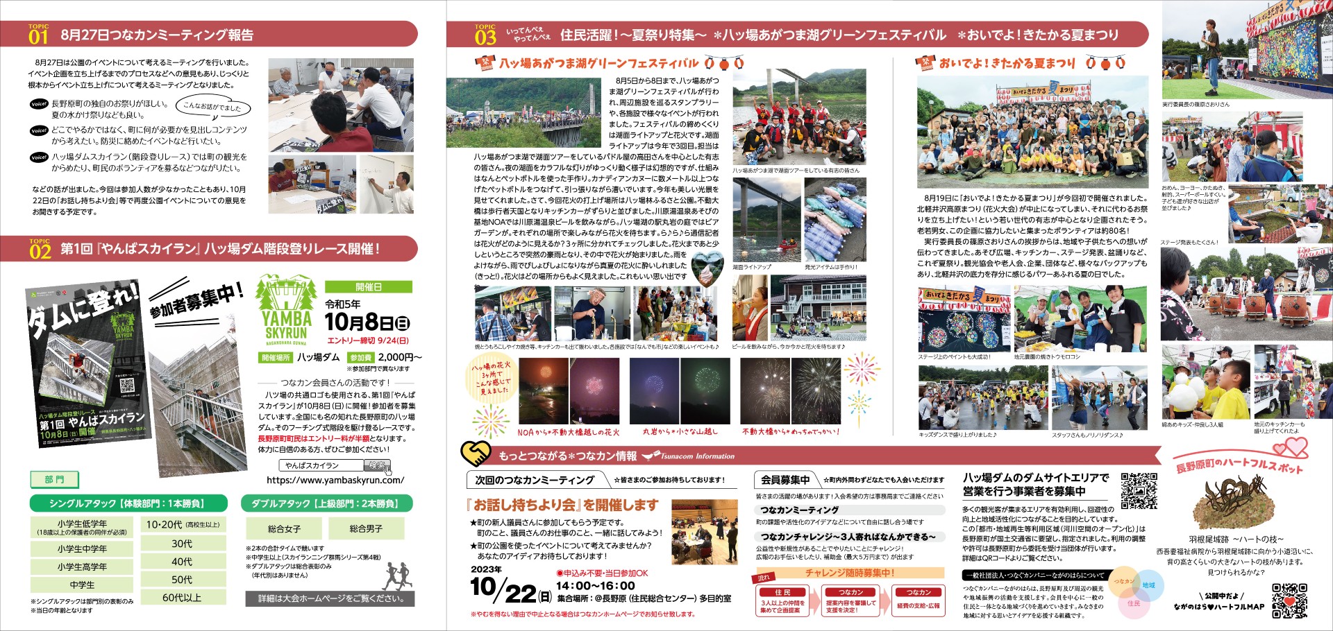 活動報告は、つなカンプロジェクトから「長野原町花いっぱいプロジェクト」。つなカン事業から「つなカンミーティング」、「つなカンツアーズ」、「ふるさと再発見」。告知はつなカン会員の活動から「やんばスカイラン 八ッ場ダム階段登りレース」です。