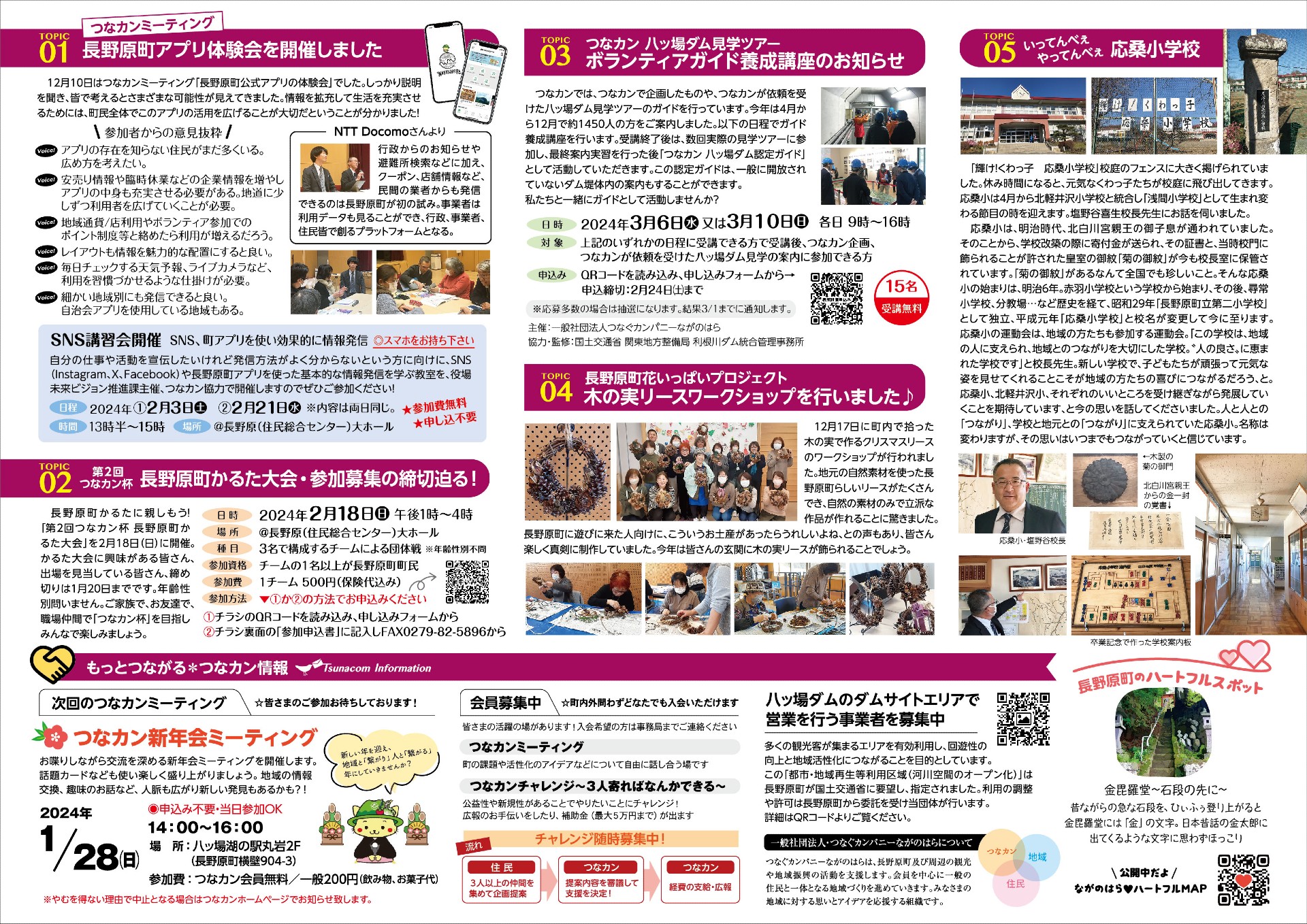 活動報告は、つなカン事業から「つなカンミーティング」、つなカンプロジェクトから「長野原町花いっぱいプロジェクト」。告知は、つなカン事業「ふるさと再発見」から〝第2回 つなカン杯 長野原町かるた大会〟の参加者募集、「つなカンツアーズ」から〝つなカン 八ッ場ダム見学ツアー ボランティアガイド養成講座〟の受講者募集です。